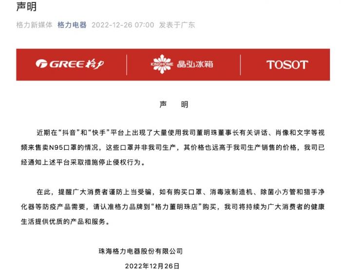 12月26日,就近期在“抖音”和“快手”平台上出现大量使用格力电器董事长董明珠有关讲话、肖像和文字等视频来售卖N95口罩的情况,格力电器(000651.SZ)在其官方公众号“格力新媒体”上发布声明,称这些口罩并非格力电器生产,其价格也远高于公司生产销售的价格,已经通知相关平台采取措施停止侵权行为。