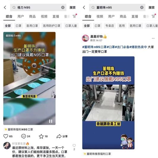 26日上午,记者在“抖音”和“快手”平台上搜索“董明珠N95”“格力N95”等关键词可以看到相关侵权视频仍然存在,视频内容大致为“董明珠建议出门佩戴N95口罩并且决定生产,不为赚钱,只为承担更多社会责任。”