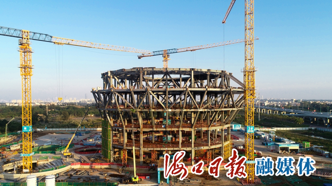 (12月9日,在海南科技馆建筑工程项目施工现场,工人有条不紊地架设主馆钢结构,一派繁忙景象。)