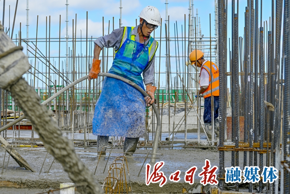 (海口市人民医院西院项目施工现场,工人在使用振导器使混凝土密实结合。)