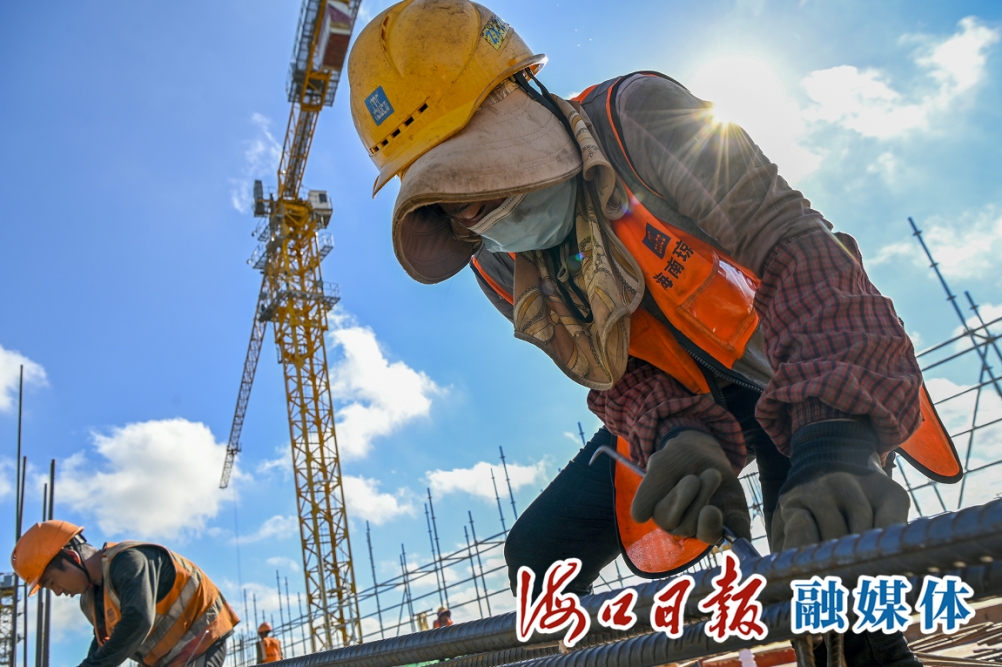 (11月29日,海口市人民医院西院项目施工现场,工人正在绑扎钢筋。)