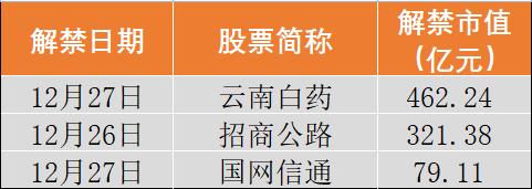 ➤沪深两市共有79家公司限售股陆续解禁,合计解禁量77.87亿股,解禁市值为1304.64亿元(以12月23日收盘价计算)。解禁市值排名前三的个股分别为: