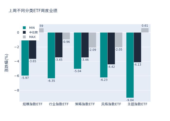 上周股票型ETF周度收益率中位数为-3.8049999999999997%。其中按照不同分类,规模指数中新经济周度收益率最高,为0.59%;行业指数中建信中证饮料主题ETF周度收益率最高,为-0.96%;策略指数中质量ETF周度收益率最高,为-2.09%;风格指数中招商中证银行AH价格优选ETF周度收益率最高,为-2.05%;主题指数中浦银安盛中证沪港深游戏及文化传媒ETF周度收益率最高,为0.61%。