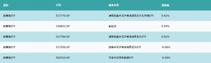 上周股票型ETF涨幅最高的5支ETF及其收益率分别为:浦银安盛中证沪港深游戏及文化传媒ETF(0.61%)、新经济(0.59%)、浦银安盛中证沪港深消费龙头ETF(0.01%)、招商中证沪港深消费龙头ETF(-0.06%)、华宝中证绿色能源ETF(-0.09%)。详情见下表: