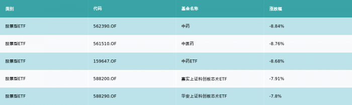 上周股票型ETF跌幅最大的5支ETF及其收益率分别为:中药(-8.84%)、中医药(-8.76%)、中药ETF(-8.68%)、嘉实上证科创板芯片ETF(-7.91%)、华安上证科创板芯片ETF(-7.8%)。详情见下表: