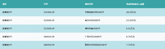 上周股票型ETF资金流入最多的5支ETF及其流入金额分别为:华泰柏瑞沪深300ETF(流入28.43亿元)、南方中证500ETF(流入23.52亿元)、博时标普500ETF(流入9.51亿元)、广发中证1000ETF(流入8.75亿元)、鹏扬中证科创创业50ETF(流入7.73亿元)。详情见下表: