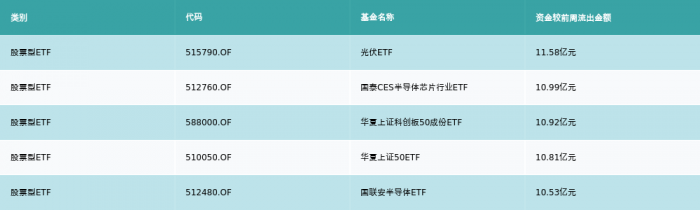 上周股票型ETF资金流出最多的5支ETF及其流入金额分别为:光伏ETF(流出11.58亿元)、国泰CES半导体芯片行业ETF(流出10.99亿元)、华夏上证科创板50成份ETF(流出10.92亿元)、华夏上证50ETF(流出10.81亿元)、国联安半导体ETF(流出10.53亿元)。详情见下表: