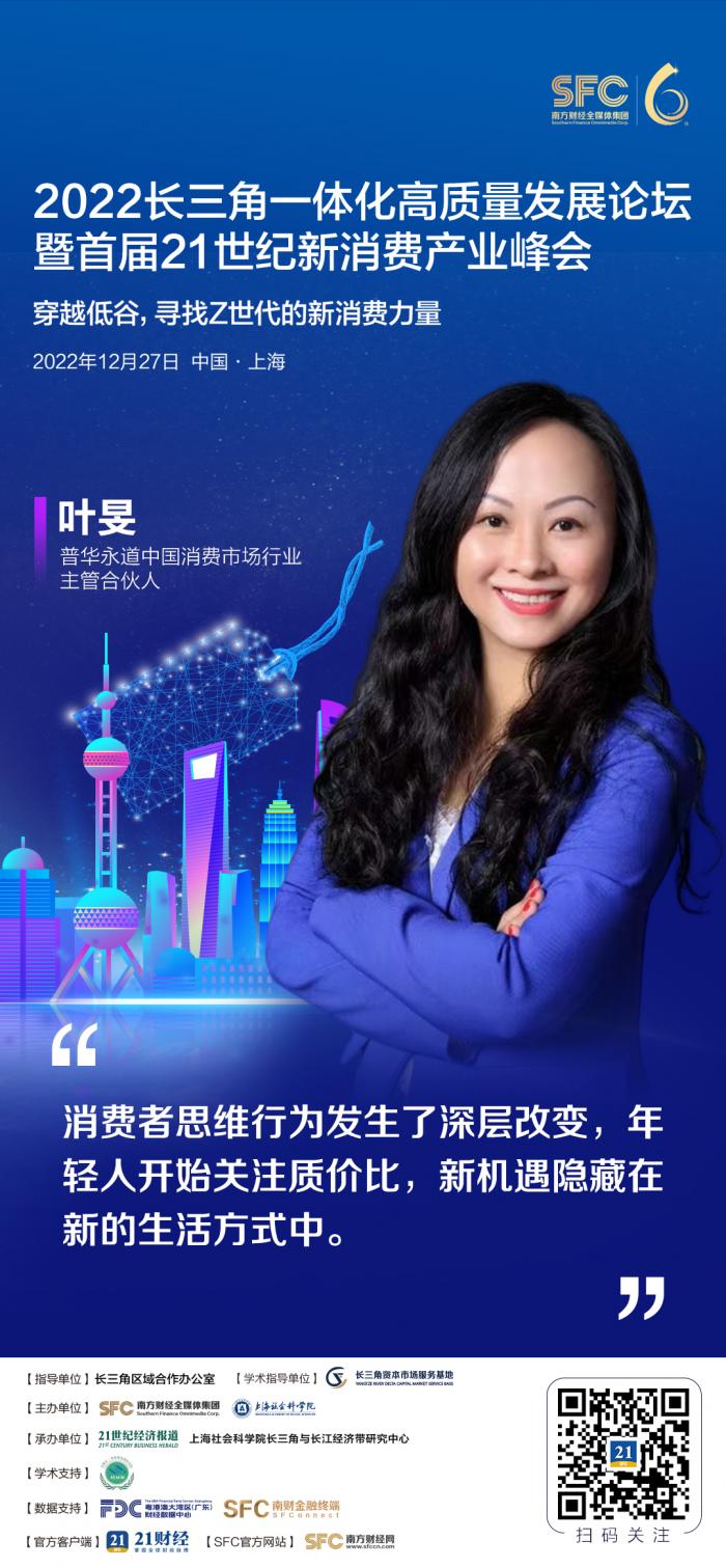 12月27日,由南方财经全媒体集团、上海社会科学院主办的“2022长三角一体化高质量发展论坛”召开。在其中的21世纪消费峰会上,普华永道中国消费市场行业主管合伙人叶旻对当前中国消费环境的挑战和消费者行为习惯进行分析,并指出国货和元宇宙带来的消费新机遇。