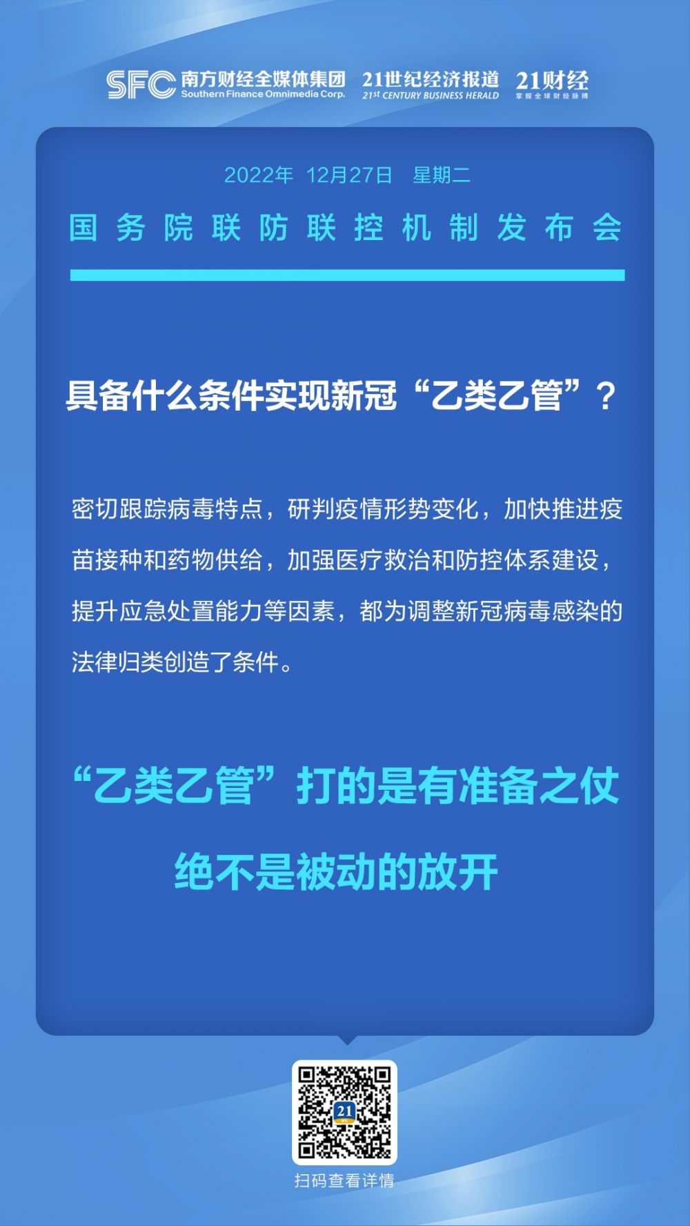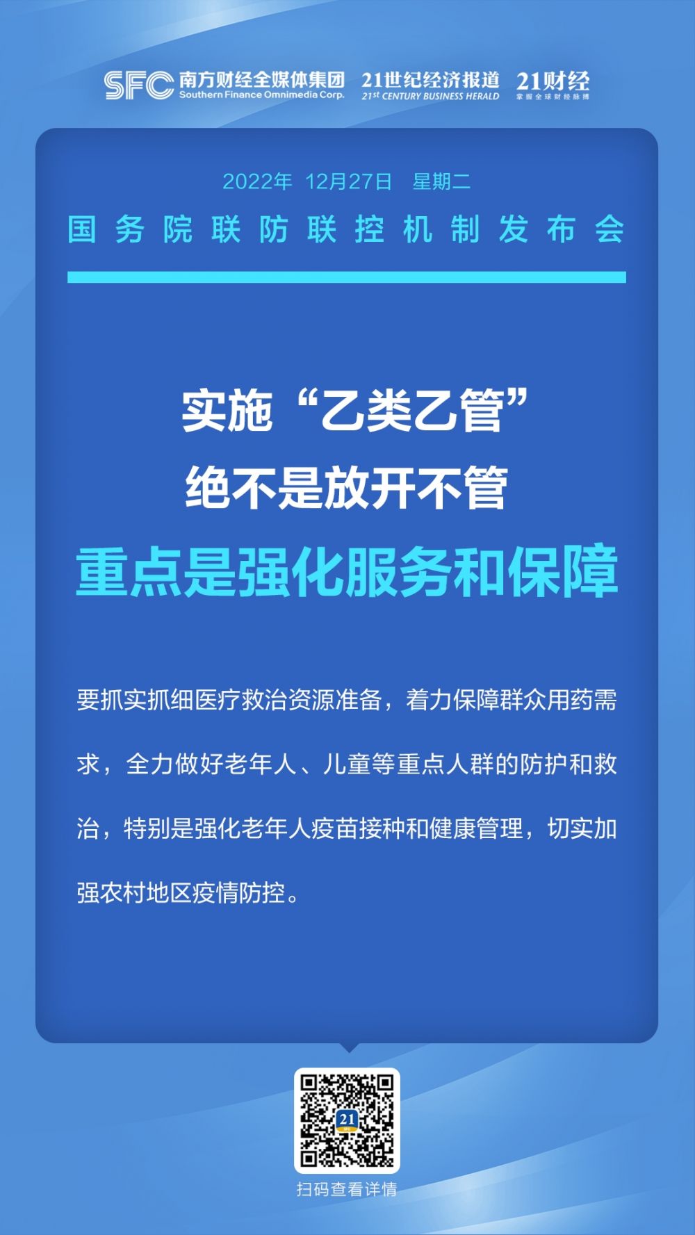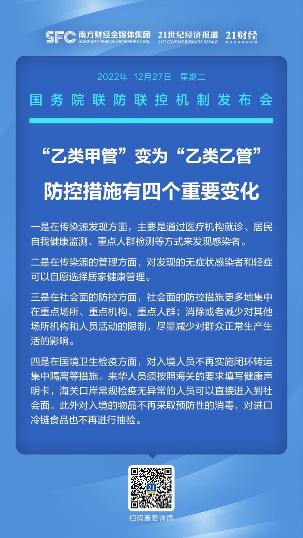 12月27日下午,国务院联防联控机制召开新闻发布会,介绍新冠病毒感染实施“乙类乙管”措施有关情况。