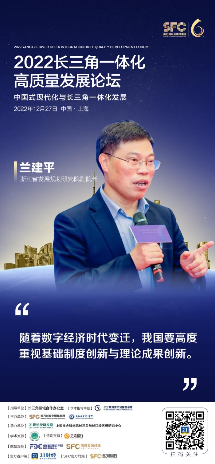 12月27日,“2022长三角一体化高质量发展论坛(第二届)”在上海举行,本届论坛由长三角区域合作办公室指导、长三角资本市场服务基地学术指导、南方财经全媒体集团与上海社会科学院发起并主办。在以“中国式现代化与长三角一体化发展”为主题的主论坛上,浙江省发展规划研究院副院长兰建平在发表主题演讲时指出,随着数字经济时代变迁,我国要高度重视基础制度创新与理论成果创新。