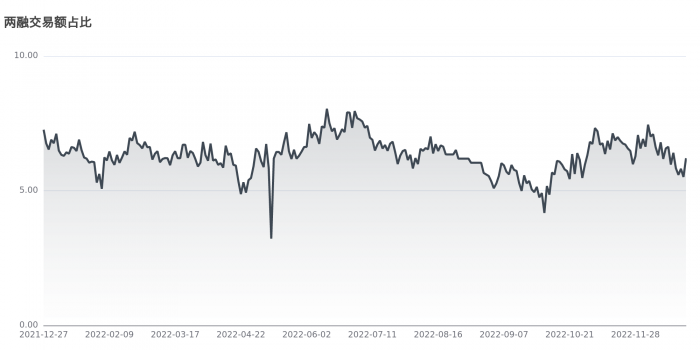 今日该指标值为6.21%,目前该指标处于近一年中立区间,说明投资者对A股持中立情绪。反映场内投资者借钱炒股的杠杆水平,该指标越高说明杠杆水平越高,即投资者认为当前市场较强,反之则说明投资者认为市场相对较弱,因而与上证指数存在较强的正相关性。