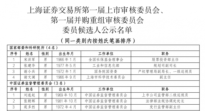 近日,沪深交易所公布了第一届上市审核委员会、第一届并购重组审核委员会委员候选人名单,公示期为5个工作日。