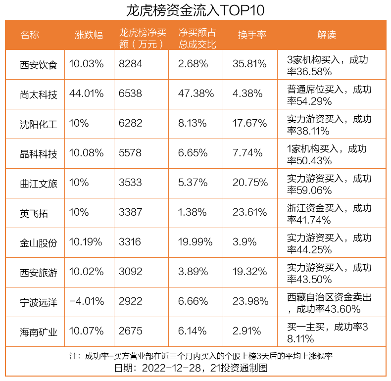 12月28日,上证指数下跌0.26%,深证成指下跌0.86%,创业板指下跌0.9%。盘后龙虎榜数据显示,共有34只个股因当日异动登上龙虎榜,资金净流入最多的是西安饮食(000721.SZ),达0.83亿元。