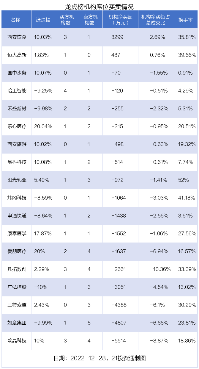 其中,机构净买入金额最多的是西安饮食(000721.SZ)。前五大买卖营业部中有4家机构,为合计净买入8299万元,占总成交金额的2.69%。