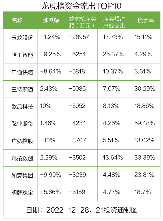 而龙虎榜中资金净流出最多的是玉龙股份(601028.SH),被净卖出为2.7亿元,占总成交金额的17.73%。玉龙股份收盘下跌1.24%,换手率为15.11%。