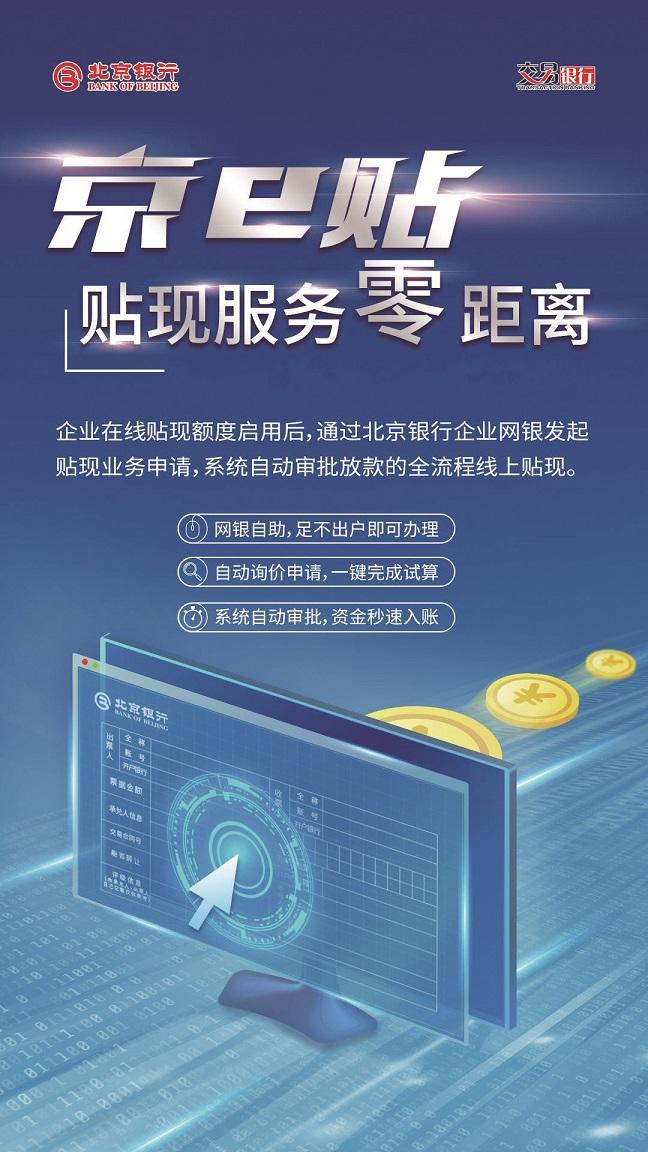 今年上半年,北京银行优化升级了秒贴产品“京e贴”。该产品采用系统自动审核替代人工审核,实现贴现全流程线上作业、贴现资金实时到账,受到了企业的广泛好评。特别是疫情期间,企业融资需求大,高效便捷的票据贴现成为助推企业走出困境的重要工具之一。