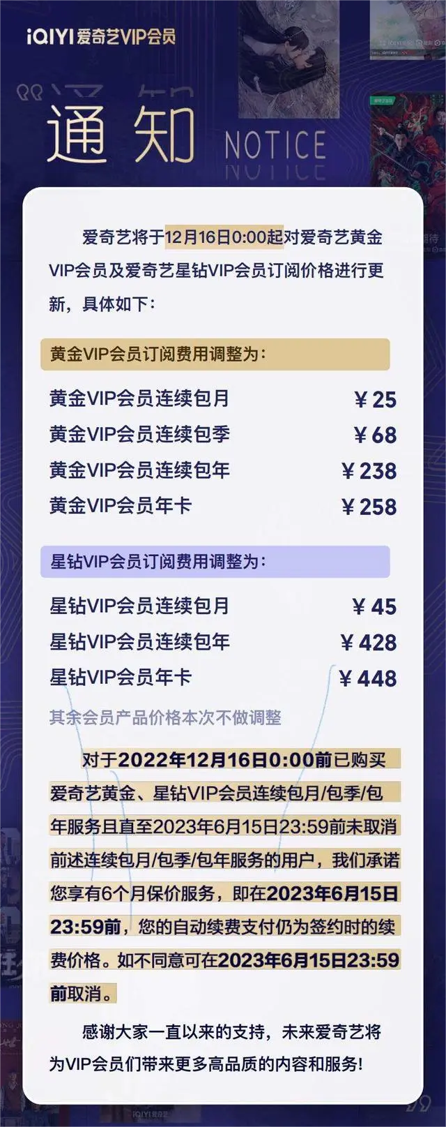 就在《风吹半夏》收官两天后,爱奇艺宣布12月16日起,黄金VIP连续包月由22元提至25元,连续包季由63元提至68元。黄金VIP会员连续包年238元,黄金VIP会员年卡258元。星钻VIP会员连续包月、连续包年、会员年卡分别为45元、428元、448元。