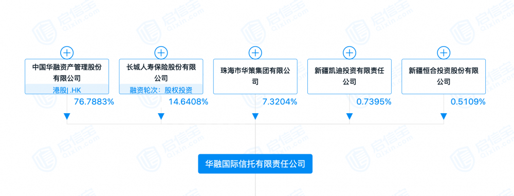 截至发稿日,启信宝显示,华融信托总计有5家股东,分别为中国华融(持股76.79%)、长城人寿(持股14.64%)、珠海市华策集团(持股7.32%)、新疆凯迪投资(持股0.74%)、新疆恒合投资(持股0.51%)。