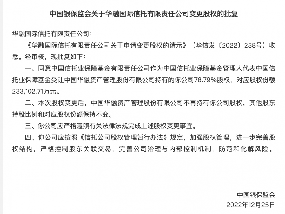 21世纪经济报道记者朱英子 北京报道 12月30日,银保监会官网显示,于2022年12月25日同意中国信托业保障基金有限责任公司作为中国信托业保障基金管理人代表中国信托业保障基金(下称“信保基金”)受让中国华融(2799.HK)持有的华融信托76.79%股权,对应股权份额233,102.71万元。