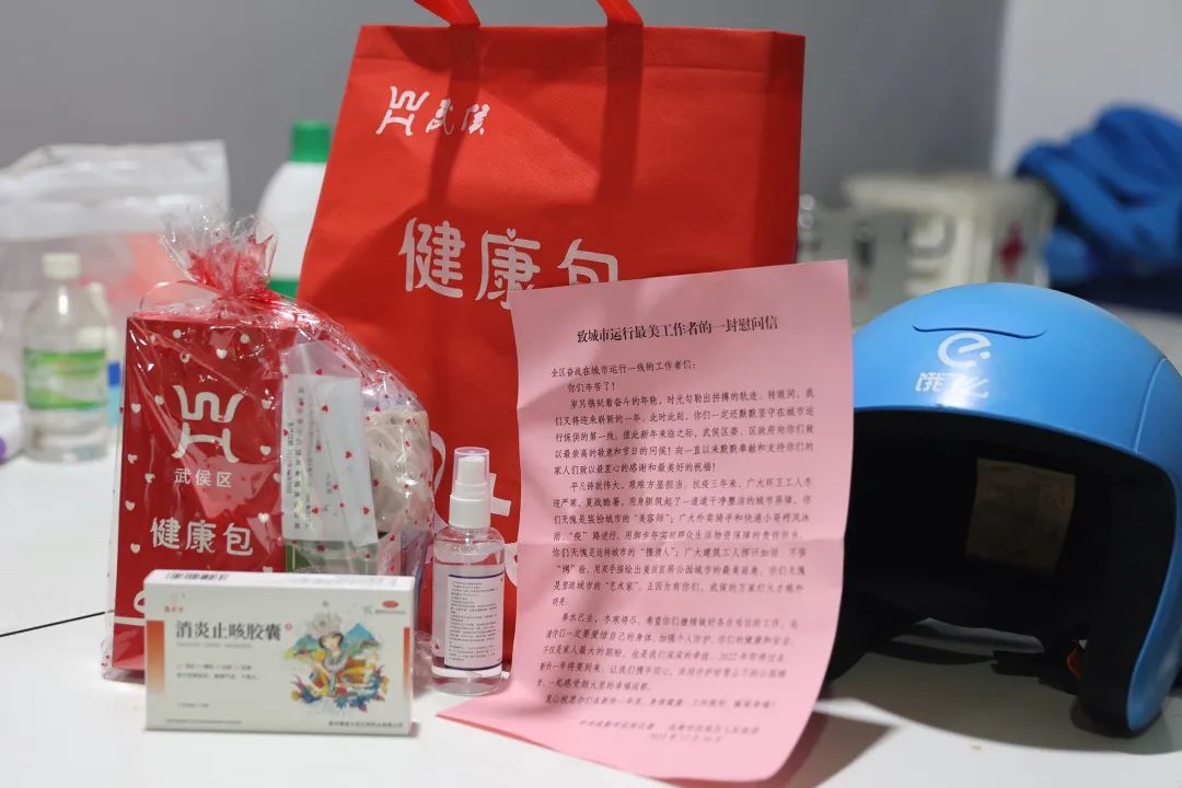 ▲武侯区爱心“健康包”及慰问信“最近身体怎样,有没有不舒服?”在红牌楼街道永盛东街,工作人员为这里的几家美团配送站送来了“健康包”,详细了解骑手们近期的生活与身体情况,耐心倾听他们的需求,宣传科普最新防疫政策与防护知识。