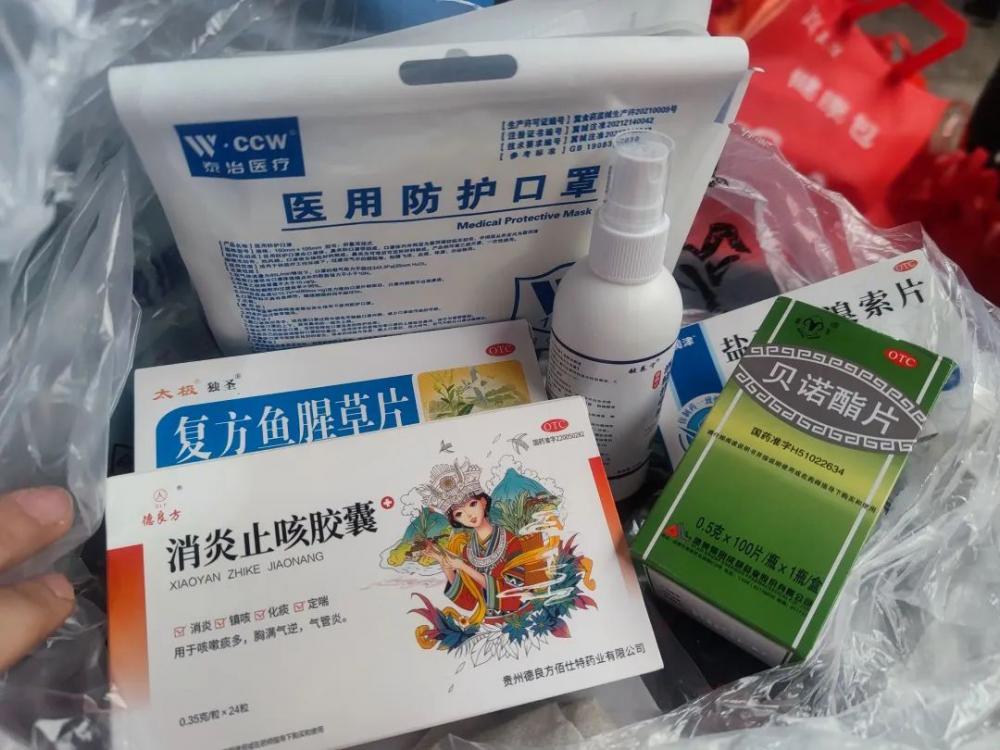在健康包内,我们为大家提供了一些药品和防护用品,请大家科学防疫、合理用药。