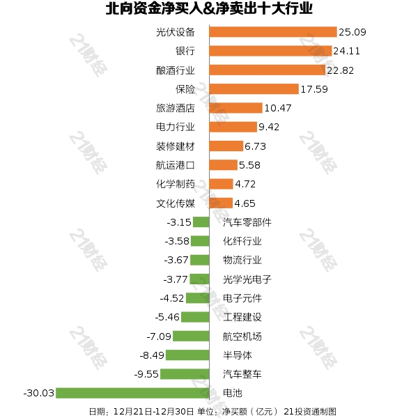 从净买入金额来看,北向资金增持了65个行业,其中光伏设备居首,净买入金额达25.09亿元,其次是银行行业,净买入24.11亿元。
