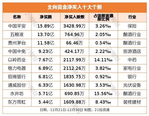 据21投资通智能监测,过去五个交易日,北向资金累计净买入75.9亿元,其中仅在本周四(12月29日)净卖出11.1亿元,其余四个交易日均保持净流入。