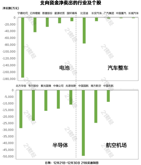 北向资金净卖出宁德时代(300750.SZ)、比亚迪(002594.SZ)、伊利股份(600887.SH)、美的集团(000333.SZ)、国电南瑞(600406.SH)居前,其中,宁德时代被净卖出17.66亿元,比亚迪被净卖出7.64亿元,伊利股份被净卖出6.83亿元,美的集团被净卖出6.29亿元,国电南瑞被净卖出5.69亿元。