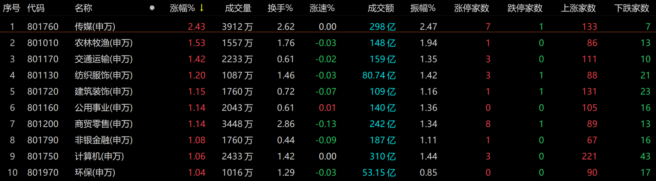 盘面上,31个申万一级行业中,传媒、农林牧渔、交通运输、纺织服饰、建筑装饰、公用事业、商贸零售、非银金融等板块涨幅相对居前,有色金属、医药生物、钢铁等板块则跌幅居前。概念股方面,数据确权概念板块延续涨势。
