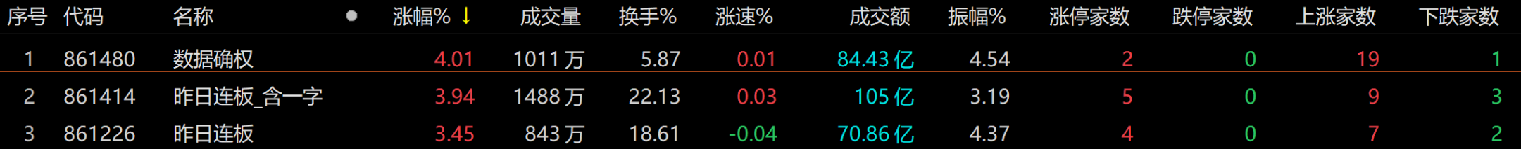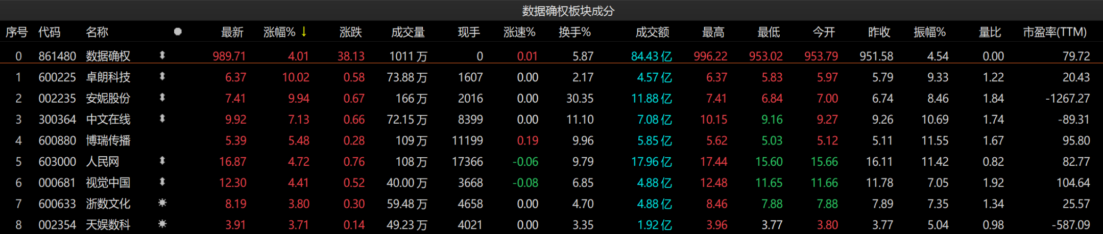 概念股方面,数据确权概念以4.01%的涨幅领涨。