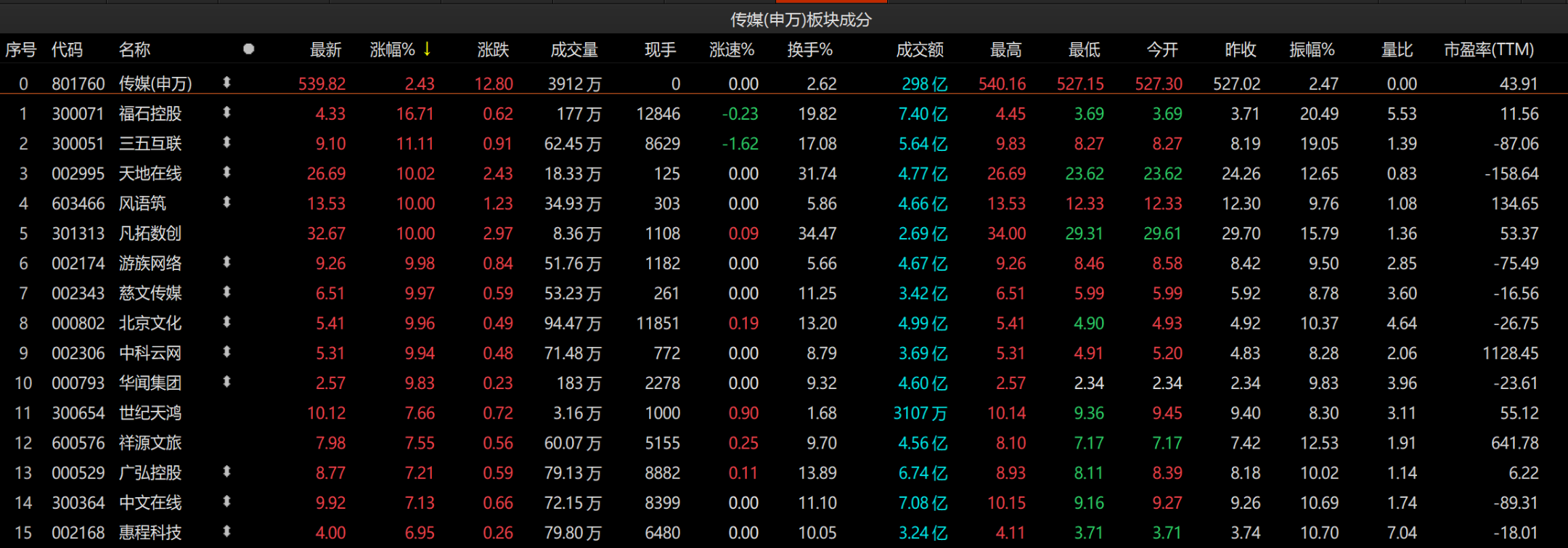 31个申万一级行业中,传媒板块以2.43%的涨幅领涨各行业板块。板块内133只个股上涨,仅7只个股收跌。具体来看,福石控股、三五互联涨超10%,分别大涨16.71%、11.11%。另外,天地在线、风语筑、凡拓数创、游族网络、慈文传媒、北京文化、中科云网等多股涨停。