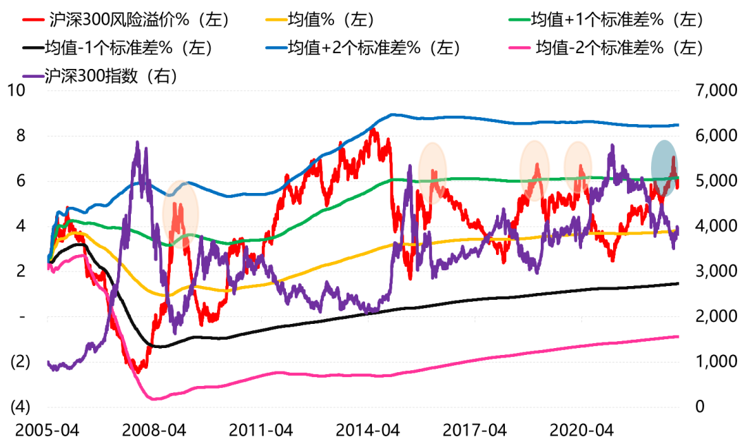 ▍图4:沪深300指数风险溢价尚在高位,对应指数底部进一步夯实
