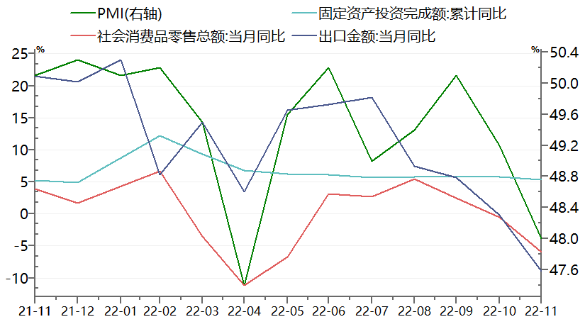 11月以来,防疫政策持续更新调整,感染人数快速上升,对经济活动压制明显。11月份PMI指标萎缩至荣枯线之下的48。经济三驾马车中的固定资产投资增速受基建支撑回落幅度较小,而出口同比增速下行至-8.9%,社会消费品零售总额同比增速明显下滑至-5.9%。