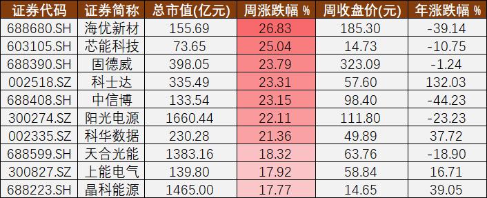 海优新材(688680.SH)、芯能科技(603105.SH)、固德威(688390.SH)在板块内领涨,周涨幅为26.83%、25.04%、23.79%。
