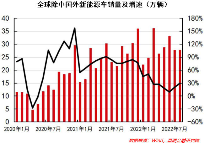 综合来看,2022年全球新能车销量的增速亮眼,但其中主要由中国贡献,从前三季度统计数据看,中国新能车销量占全球比重近70%。除中国之外,全球新能源车销量同比增长20%-30%之间。
