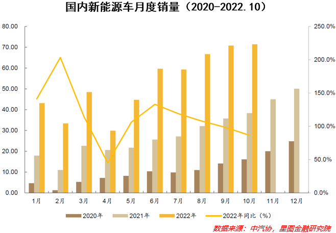 从国内市场的驱动因素看,政策端购置税减免及购车补贴政策的延续,一定程度上刺激了国内市场需求的提前爆发。同时,由于2022年初俄乌冲突的爆发,油价高涨并全年处于高位,新能车相对于燃油车的性价比凸显。根据中汽协数据,2022年1-10月,国内新能源汽车销量为609万辆,同比增长超过100%,渗透率在11月单月达到36.3%,预计全年国内新能源车销量将超过700万辆。