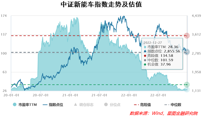最后,从指数走势看,当前指数及估值均处于较低位置,指数具有较高配置的性价比。虽然说估值并不能决定一切,但毫无疑问,估值的高低对于当前如何看待新能车未来的投资价值,有极其重要的影响。以中证新能源汽车产业指数(930997.CSI)为例,指数在经过了2022年下半年近半年的下跌后,新能车指数的估值目前已经达到了绝对的历史低位。截止2022年12月27日,新能源车指数PETTM保持在28x附近,估值分位点处于近三年1.4%的分位点左右,处于绝对的历史低位。