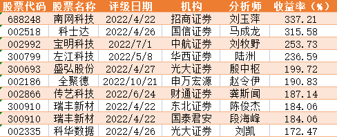 第四名的左江科技属于计算机行业的软件开发板块,是领先的网络信息安全装备供应商,主营信息安全领域相关的软硬件平台、板卡和芯片的设计、开发、生产与销售。华西证券的陆洲分析师在5月8日为公司作出了点评,对应的收益率为236.59%,其分析道:我们看好公司在军用保密通信设备领域的核心地位以及新拓展DPU业务的广阔应用前景,维持“买入”评级。