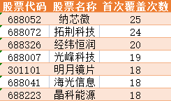 首次覆盖次数并列第5名的公司共有三家,分别是在轻工制造行业从事镜片、镜片原料、成镜和镜架等眼视光产品研发、设计、生产和销售的明月镜片,在电子-半导体板块从事研发、设计和销售应用于服务器、工作站等计算、存储设备中的高端处理器的海光信息,在电力设备-光伏设备板块从事光伏组件、电池片、硅片的研发、生产和销售以及光伏技术应用和产业化的晶科能源。