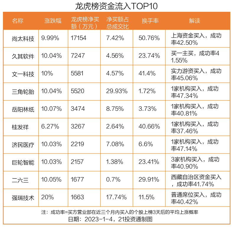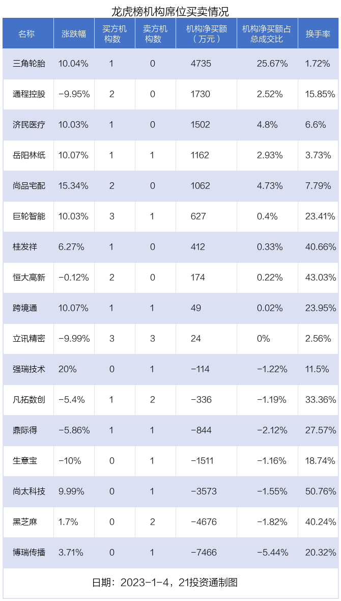 其中,机构净买入金额最多的是三角轮胎(601163.SH),当日收盘上涨10.04%,换手率为1.72%。