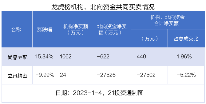 值得注意的是,机构和北向资金在尚品宅配、立讯精密上出现分歧,机构净买入尚品宅配1061.58万元,北向资金净卖出621.86万元;机构净买入立讯精密24.29万元,北向资金净卖出2.75亿元。
