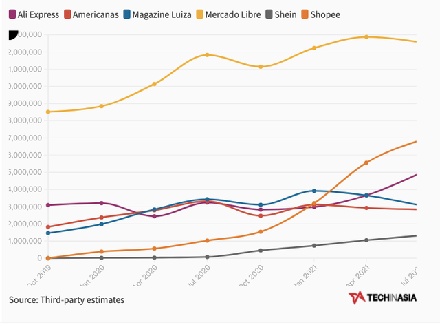 而在电商平台方面,拉美本土的美客多在市场份额方面处于一骑绝尘的状态。而就在2022年,有中国背景的电商平台崛起成为重要趋势,尤其在巴西这个最大的市场中,Shopee、AliExpress的下载量开始从第二集团竞争中脱颖而出。