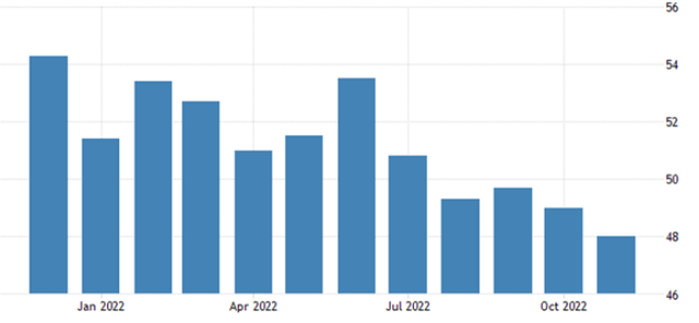 根据亚太经合组织(OECD)数据,2022年二季度世界经济环比增速降至0.1%,第三季度,全球经济在中国和美国拉动下有所反弹,但包括英国、日本等主要经济体经济低迷。世界采购经理指数(PMI)8月跌至50荣枯线以下,11月更是降至48,达到29个月以来新低。越来越多的信号表明,四季度全球经济面临着更大的挑战。