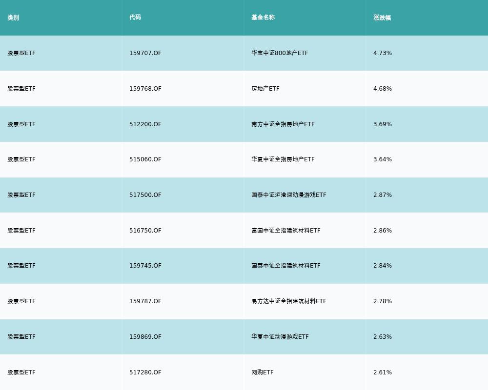 昨日股票型ETF涨幅最高的3支ETF及其收益率分别为:华宝中证800地产ETF(4.73%)、房地产ETF(4.68%)、南方中证全指房地产ETF(3.69%)。涨幅前10详情见下表: