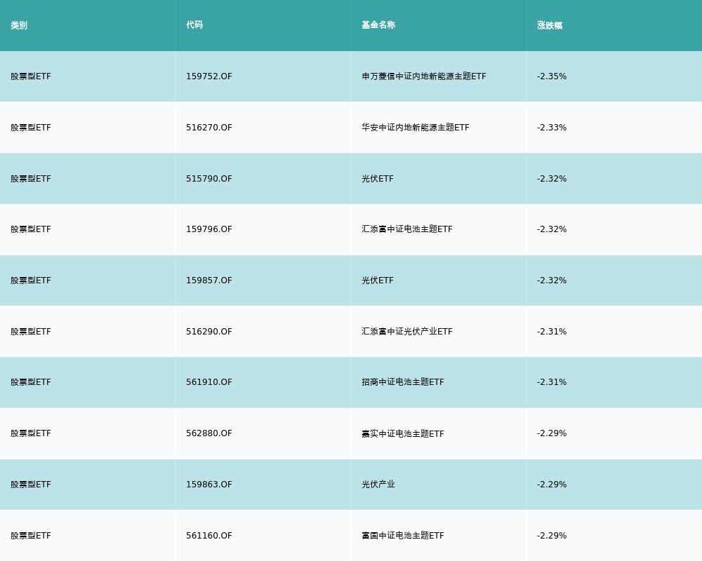 昨日股票型ETF跌幅最大的3支ETF及其收益率分别为:申万菱信中证内地新能源主题ETF(-2.35%)、华安中证内地新能源主题ETF(-2.33%)、光伏ETF(-2.32%)。跌幅前10详情见下表: