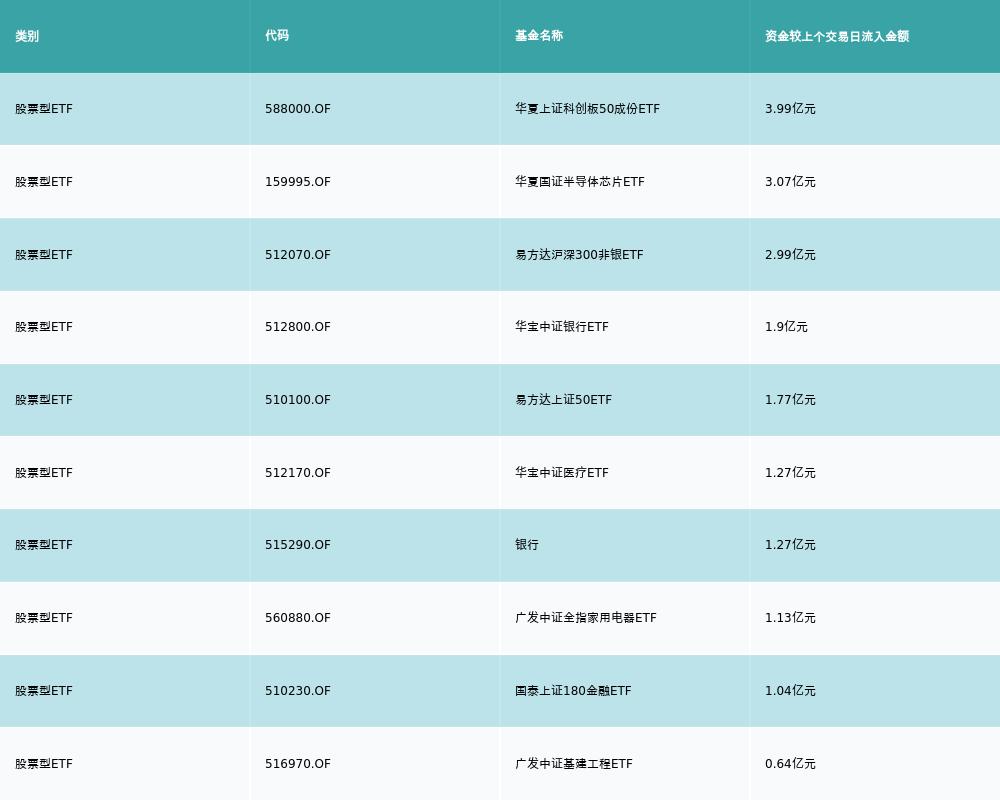 昨日股票型ETF资金流入最多的3支ETF及其流入金额分别为:华夏上证科创板50成份ETF(流入3.99亿元)、华夏国证半导体芯片ETF(流入3.07亿元)、易方达沪深300非银ETF(流入2.99亿元)。资金流入前10详情见下表: