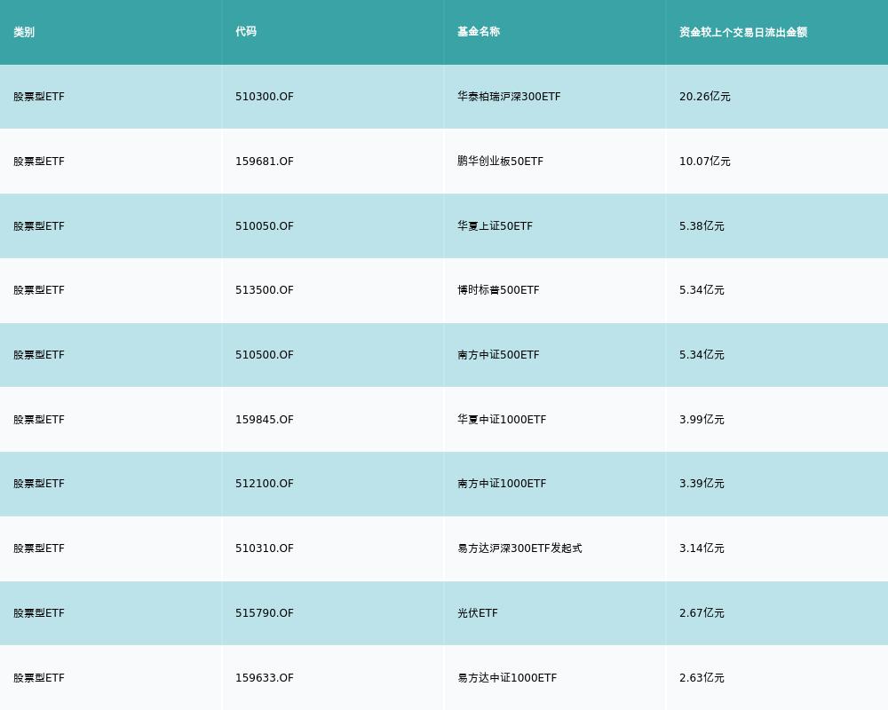 昨日股票型ETF资金流出最多的3支ETF及其流入金额分别为:华泰柏瑞沪深300ETF(流出20.26亿元)、鹏华创业板50ETF(流出10.07亿元)、华夏上证50ETF(流出5.38亿元)。资金流出前10详情见下表: