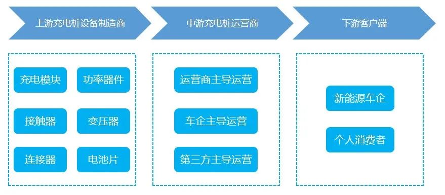 当前,新能源车充电桩产业链上游,是建设及运营充电桩所需要的元器件和设备生产商。行业中游,则是充电运营商。而产业链下游的各类充电场景参与者,主要是各类新能源车车用户。