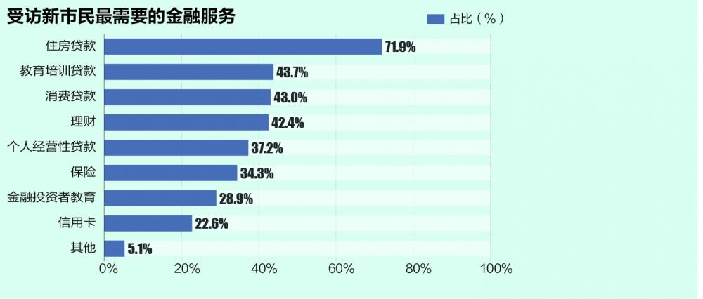 新市民的金融服务需求方面,《报告》指出,住房贷款、教育培训贷款和消费贷款是新市民最需要的三类金融服务,且不同年龄、学历、收入和职业的受访人群几乎一致认为新市民最需要住房贷款。具体数据来看,71.9%的受访者认为,住房贷款是新市民最需要的金融服务;43.7%的人表示新市民最需要教育培训贷款,43.0%的人表示新市民最需要消费贷款。