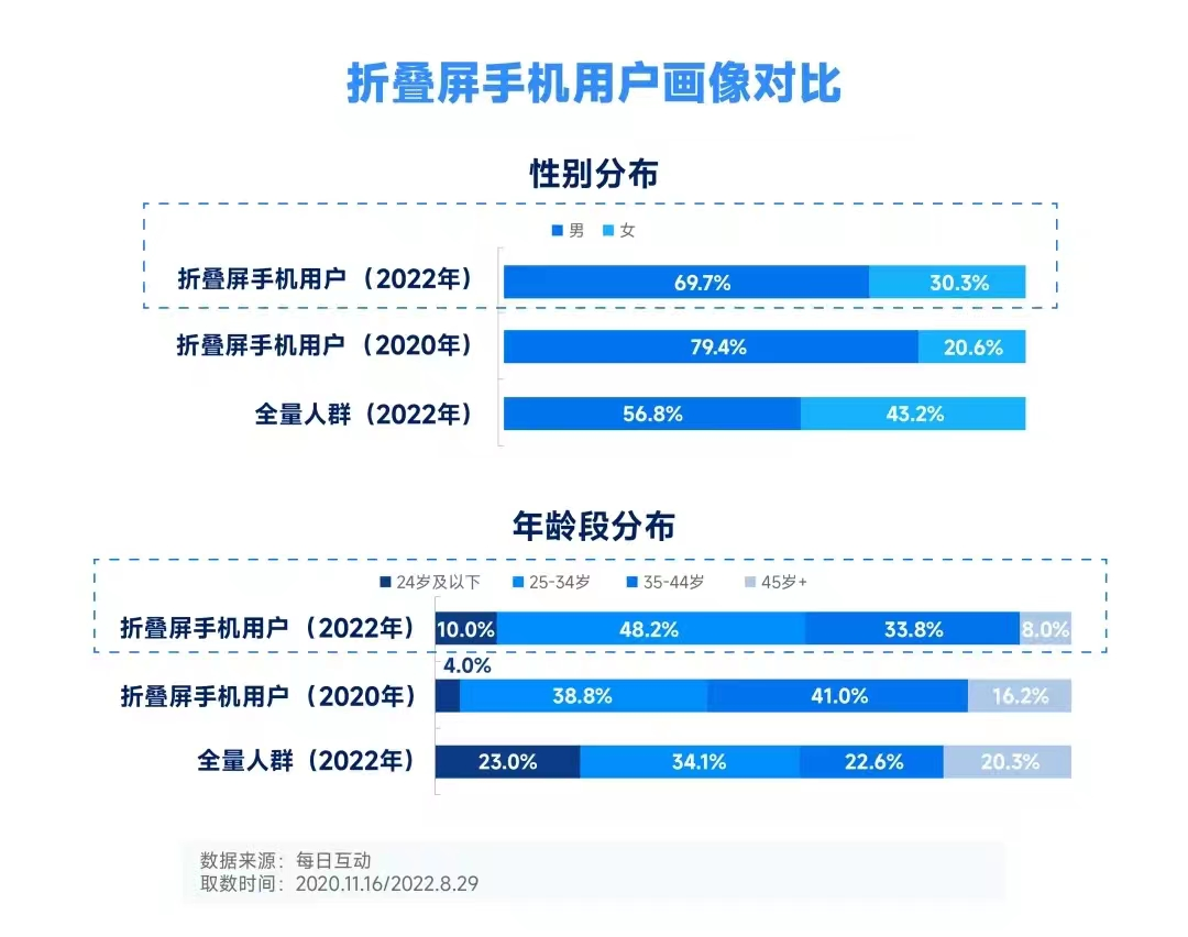 从需求端来看,用户整体呈现年轻化的趋势。数据显示最新的折叠屏手机用户中35岁以下年轻人群增长明显,占比达到58.2%。所以供求端在续航、轻薄等功能上更迭迅速。